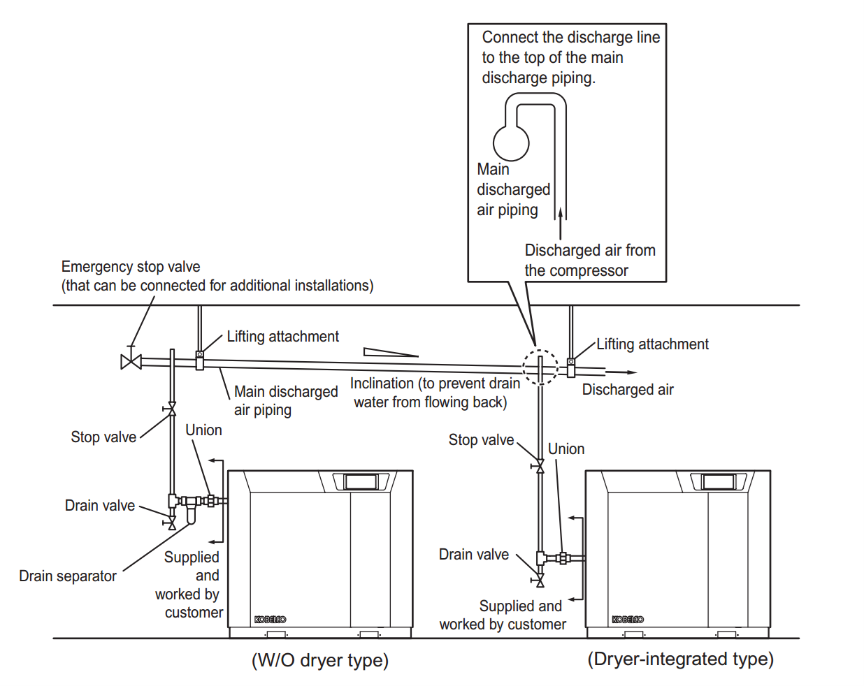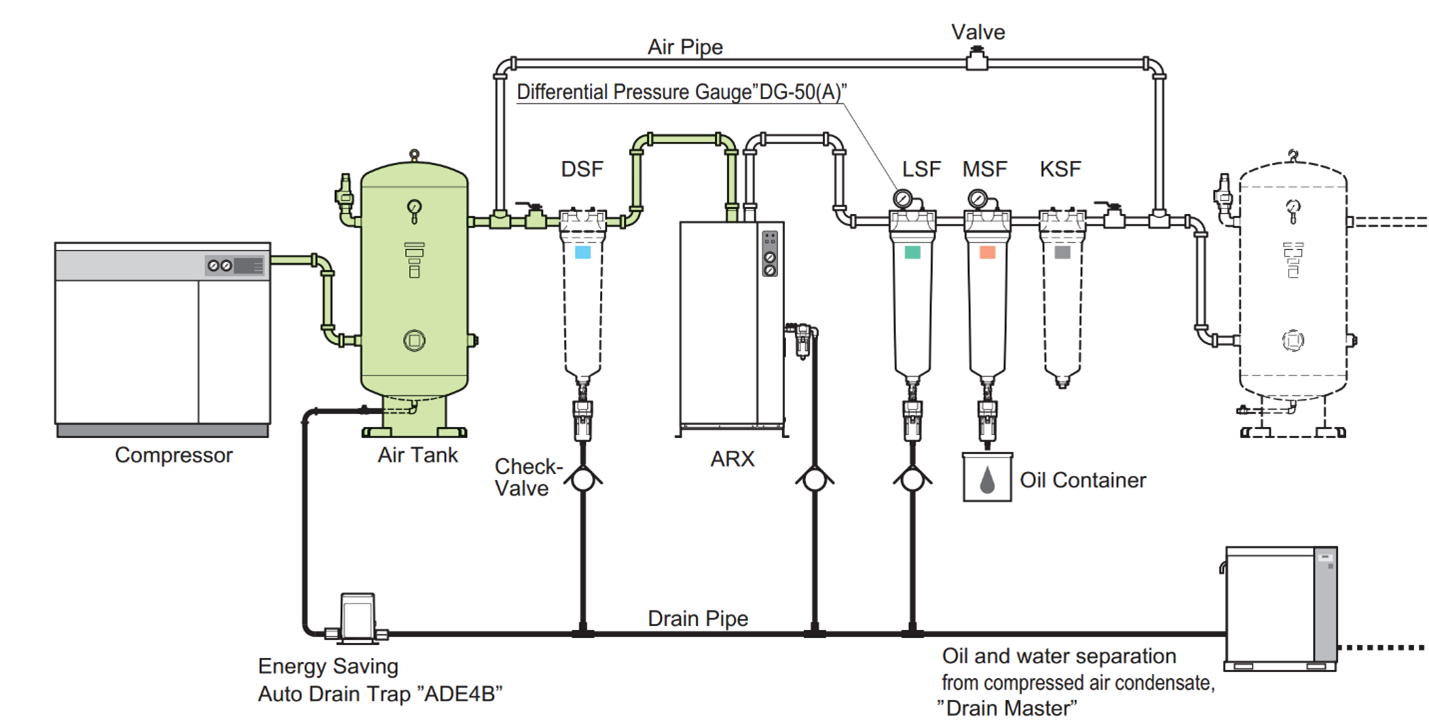 Máy nén khí, máy sấy khí, bình tích áp và lọc khí đều thải ra một lượng nước lớn. Phần đa nước này đều lẫn dầu, do đó cần lắp đường ống dẫn nước thải ra khỏi phòng máy tới khu vực xử lý để tách bỏ dầu ra khỏi nước.