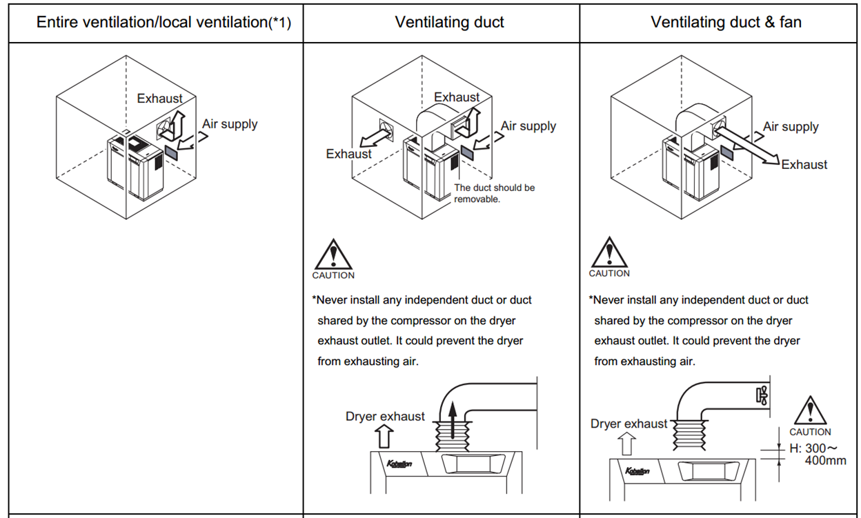 - Nhiệt tỏa ra từ giàn giải nhiệt máy nén khí/ máy sấy khí cần được dẫn ra ngoài thông qua hệ thống ống gió (Exhaust Ventilation Duct). Việc thiết kế ống gió phụ thuộc công suất máy, layout thiết bị cũng như kiểu máy nén khí.